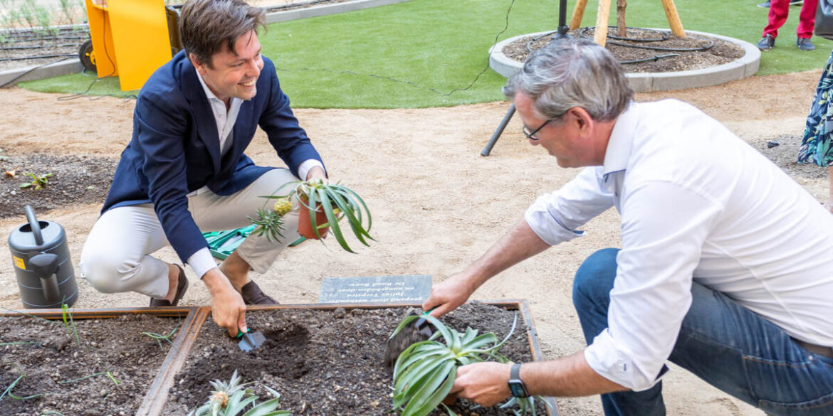 De binnentuin van het appartementencomplex De Ananas in Leiden is zaterdag op de Dag van de Bouw officieel geopend door wethouder Julius Terpstra. Op de tweede verdieping van het complex legde Terpstra samen met adjunct-directeur Wouter de Wolff van De Raad Bouw een openingstegel en plantte ananasplanten.