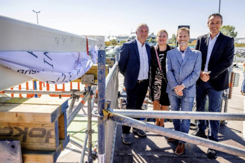 LEIDEN – De bouw van het CAR T-celtherapieproductiecentrum van Bristol Myers Squibb in het Leiden Bio Science Park (LBSP) gaat hard. Donderdag werd het hoogste punt bereikt en dat betekent traditiegetrouw ‘pannenbier’. In oktober 2021 werd de eerste paal van de constructie in de grond gezet, werd de vlag gehesen en startte het biofarmaceutische bedrijf de bouw van het productiecentrum. Met het plaatsen van de hoogste balk ligt het project op schema. Bristol Myers Squibb viert deze speciale dag samen met de huidige werknemers v, bouwbedrijven en buren in het Leiden Bio Science Park.