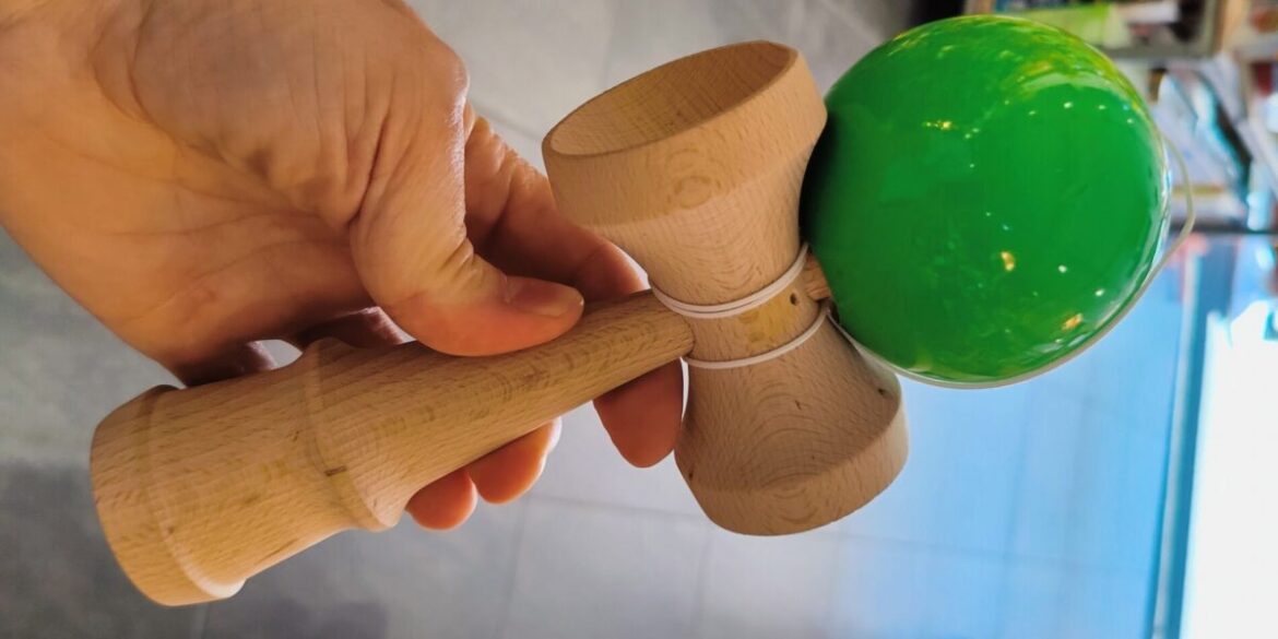 Dagobert Schulp van de Vliegerschop poseert met de Kendama die ook in Leiden te koop is.
