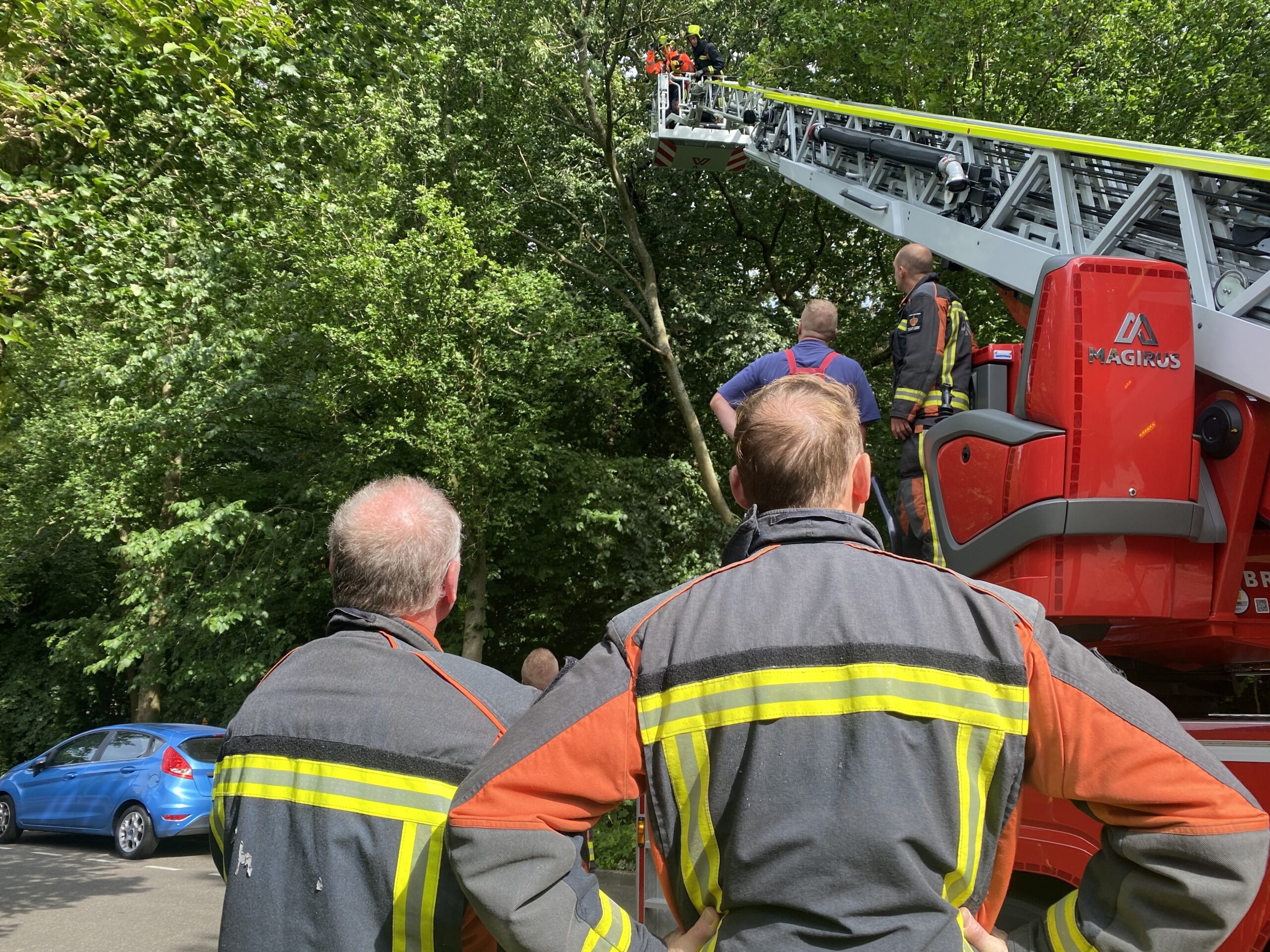 Door de harde wind dreigde een boom om te waaien. Met behulp van een ladderwagen is de boom van bovenaf in stukken gezaagd om schade te voorkomen. Tijdens de werkzaamheden werd de weg afgesloten voor verkeer.