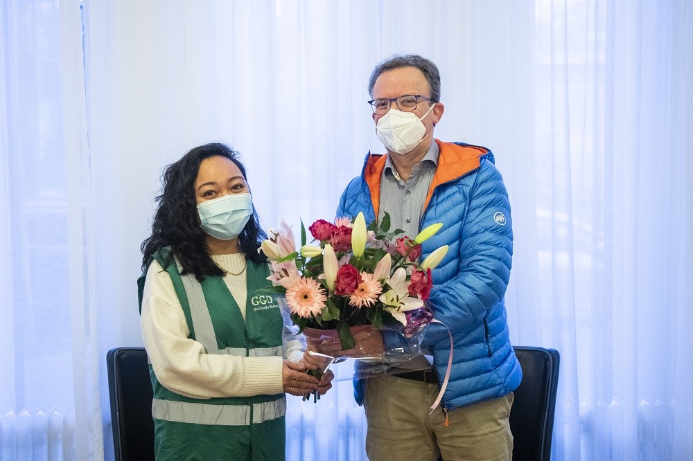OEGSTGEEST – Woensdag 18 januari kon je tussen 8.30 en 12.30 uur zonder afspraak binnenlopen bij Dorpscentrum Oegstgeest voor een corona herhaalprik. De eerste prik in Oegstgeest was voor Eric Glerum uit Oegstgeest. Hij kreeg niet alleen een herhaalprik, maar ook een bos bloemen. Ook de komende twee woensdagen (25 januari en 2 februari) kun je tussen 8.30 en 12.30 uur aan de Lijtweg 9 terecht voor een herhaalprik.