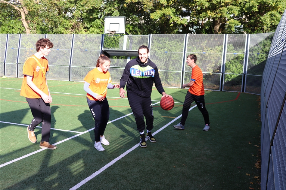 LEIDEN – Basketballers van ZZ Leiden hebben deze week het multicourt geopend van het Visser ’t Hooft Lyceum aan de Kagerstraat. De multifunctionele sportbaan biedt de mogelijkheid om meerdere sporten te beoefenen. Aanvankelijk zou de de baan vorig jaar geopend worden, maar door corona werd de school gesloten en daarmee de opening uitgesteld.