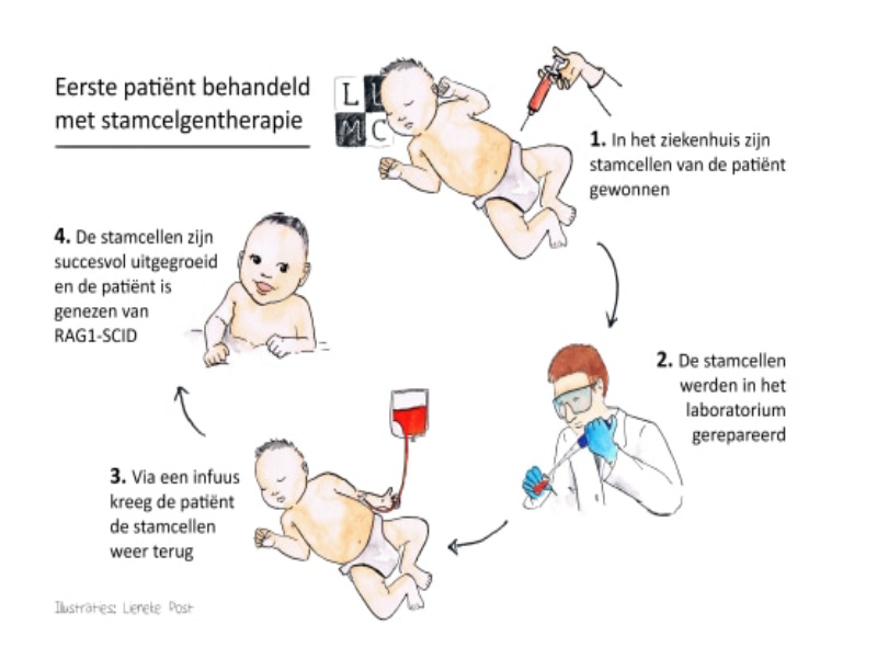 De behandelde patiënt is een baby van nog maar een paar maanden oud met de afweerziekte Severe Combined Immunodeficiency (SCID). Door een DNA-fout in de bloedstamcellen maken SCID-patiënten geen afweercellen aan en kan het lichaam zich niet verdedigen tegen infecties. De ontwikkelde stamcelgentherapie kan deze DNA-fout corrigeren. ‘De gerepareerde stamcellen zijn in het lichaam van de patiënt vervolgens uitgegroeid tot een goed werkend afweersysteem’, zegt Arjan Lankester, hoogleraar Kindergeneeskunde en Stamceltransplantatie. ‘De baby heeft de behandeling zonder problemen doorstaan en het afweersysteem reageert goed op de gebruikelijke vaccinaties voor pasgeborenen. Een fantastisch resultaat.’