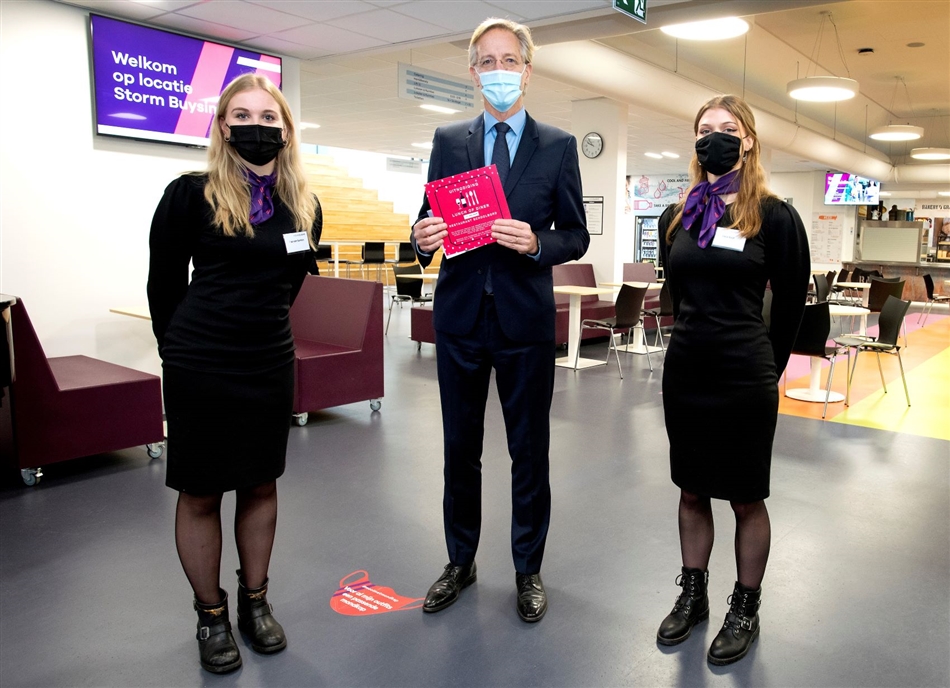 Dijkgraaf werd ontvangen door twee studenten van Toerisme en Leisure waarna hij in gesprek ging met studenten, docenten, facilitair medewerkers en conciërges. ‘Het is heel fijn dat studenten achter hun scherm vandaan zijn, en elkaar weer kunnen ontmoeten. Ook goed om te zien dat er onder hen zoveel creatieve ideeën leven over de toekomst van het onderwijs’. Na het eerste gesprek kreeg de minister een rondleiding door de praktijklokalen van de kappers en schoonheidsspecialistes, waar studenten bezig waren om de praktijk te oefenen. Daarna nam hij een kijkje bij de opleiding Orde en Veiligheid en Sport en Bewegen.