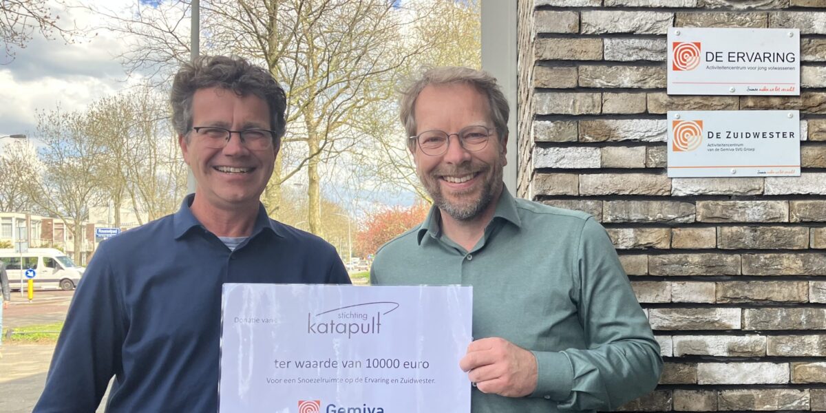 De cheque werd eind mei al overhandigd door Johan van Egmond van Katapult aan locatiemanager Koos Hoogenboom van Gemiva. De snoezelruimte voor de locatie de Zuidwester en De Ervaring aan de Kennedylaan in Leiden is net af. In zo’n ruimte kunnen de jongeren met een verstandelijke of meervoudige beperking tot rust komen als ze bijvoorbeeld overprikkeld zijn.